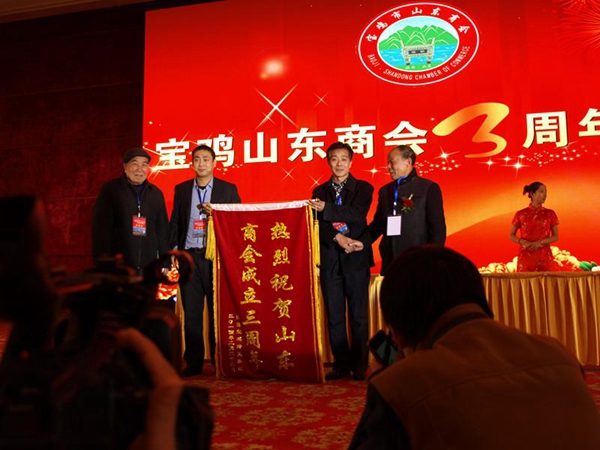 2014年2月23日,宝鸡市山东商会在高新万福七星酒店如期举行成立三周年庆典。当天,各政企部门领导、各大商会领导、山东商会全体会员、山东老乡等近600人。共聚一堂庆祝商会成立三周年,并与中国农业银行宝鸡分行、工商银行宝鸡分行、长安银行、中信银行、建设银行、农业银行、金台信用联社七家银行合作,在商会成立三周年之际,商会与各银行签订战略合作伙伴协议,共授信计43亿元,成功为新的马年开出了良好势头,商会希望与各会员企业在新的一年里一起发展,一起努力,实现共赢。针对商会今后的发展,会长杨华代表商会还特聘请宝鸡市人大副主任富君、原市人大副主任王景文、宝鸡市政协原副主席傅国诚等6人,为宝鸡市山东商会经济顾问。